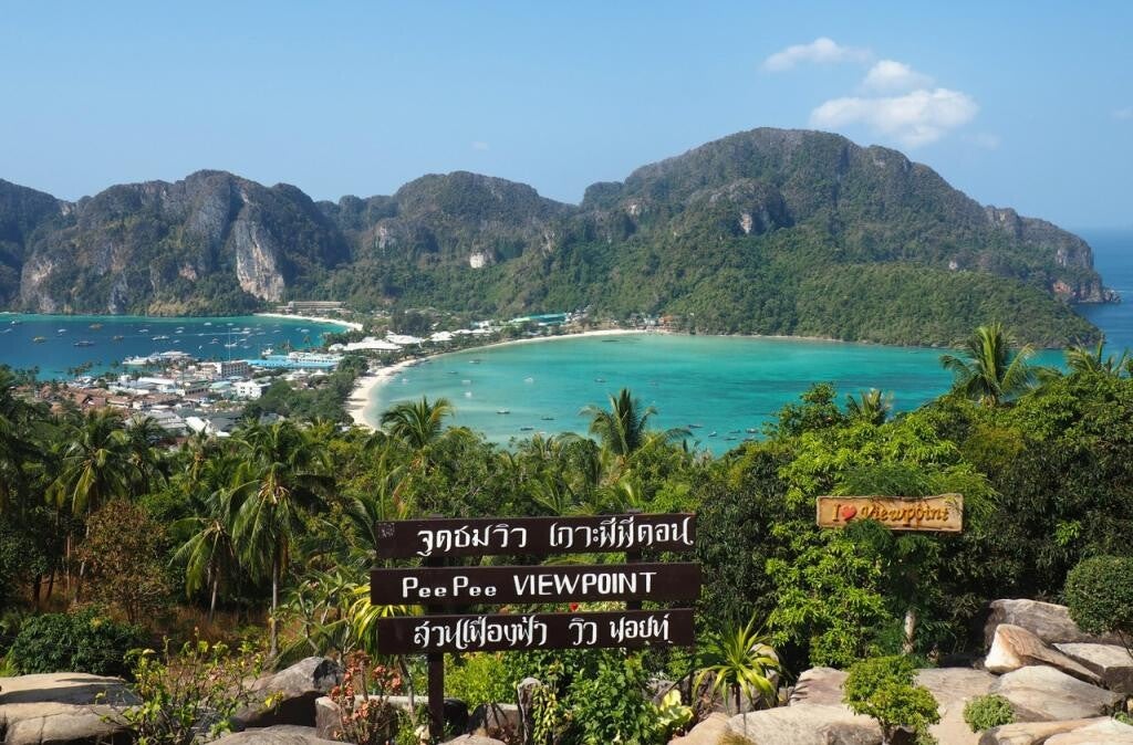 La recompensa de la subida a los miradores de Koh Phi Phi Don es la postal más icónica del archipiélago, una vista panorámica que captura la forma única de la isla, con sus dos bahías principales conectadas por el estrecho istmo central.