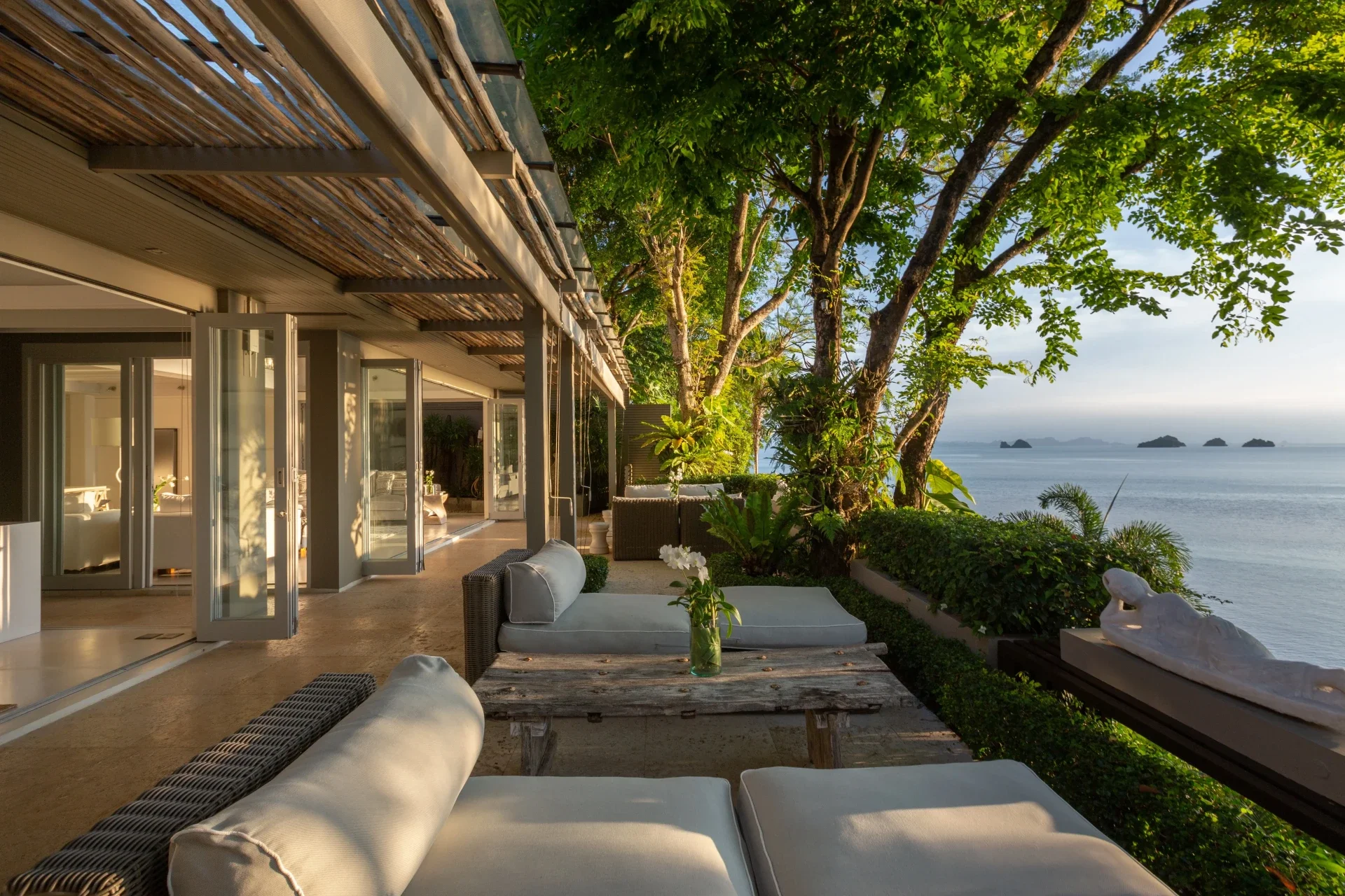 La villa combina espacios interiores y exteriores de forma fluida: una amplia zona de estar de planta abierta, comedor, cocina totalmente equipada y una terraza junto a la piscina infinity rodeada de jardines tropicales y formaciones rocosas naturales. Todo está pensado para disfrutar del entorno con calma, ya sea con un café por la mañana, una sesión de yoga o un cóctel al atardecer.